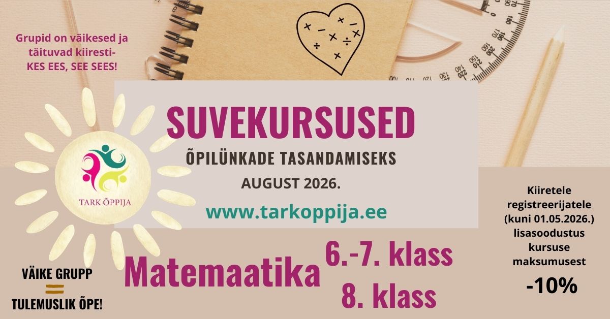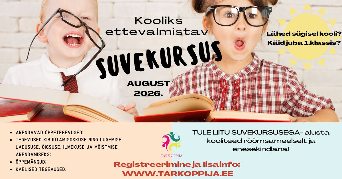Teated AVASIME REGISTREERIMISED SUVEKURSUSTELE! Kiiretele registreerijatele (kuni 31.05.2023) lisasoodustus kursuse maksumusest 10%! Kohti jagub ainult 14 kiiremale. 23 märts 2023 Aitame lapsed järjele ja harjutame, kinnistame õpitut, et õppimine oleks ja jääks rõõmuks!😉