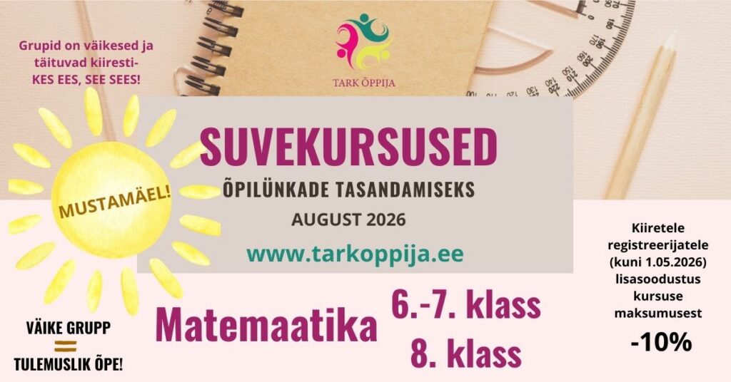 MATEMAATIKA 6.-7. klass (3.08-6.08 ja 10.08-13.08) kell 10.30-12.00 Kursusele on oodatud 2026.aastal 6. ja 7. klassi lõpetanud õpilased.