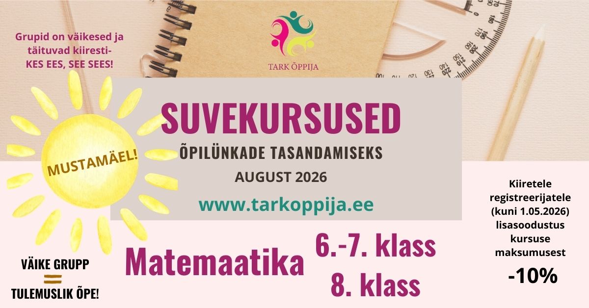 MATEMAATIKA 6.-7. klass (3.08-6.08 ja 10.08-13.08) kell 10.30-12.00 Kursusele on oodatud 2026.aastal 6. ja 7. klassi lõpetanud õpilased.
